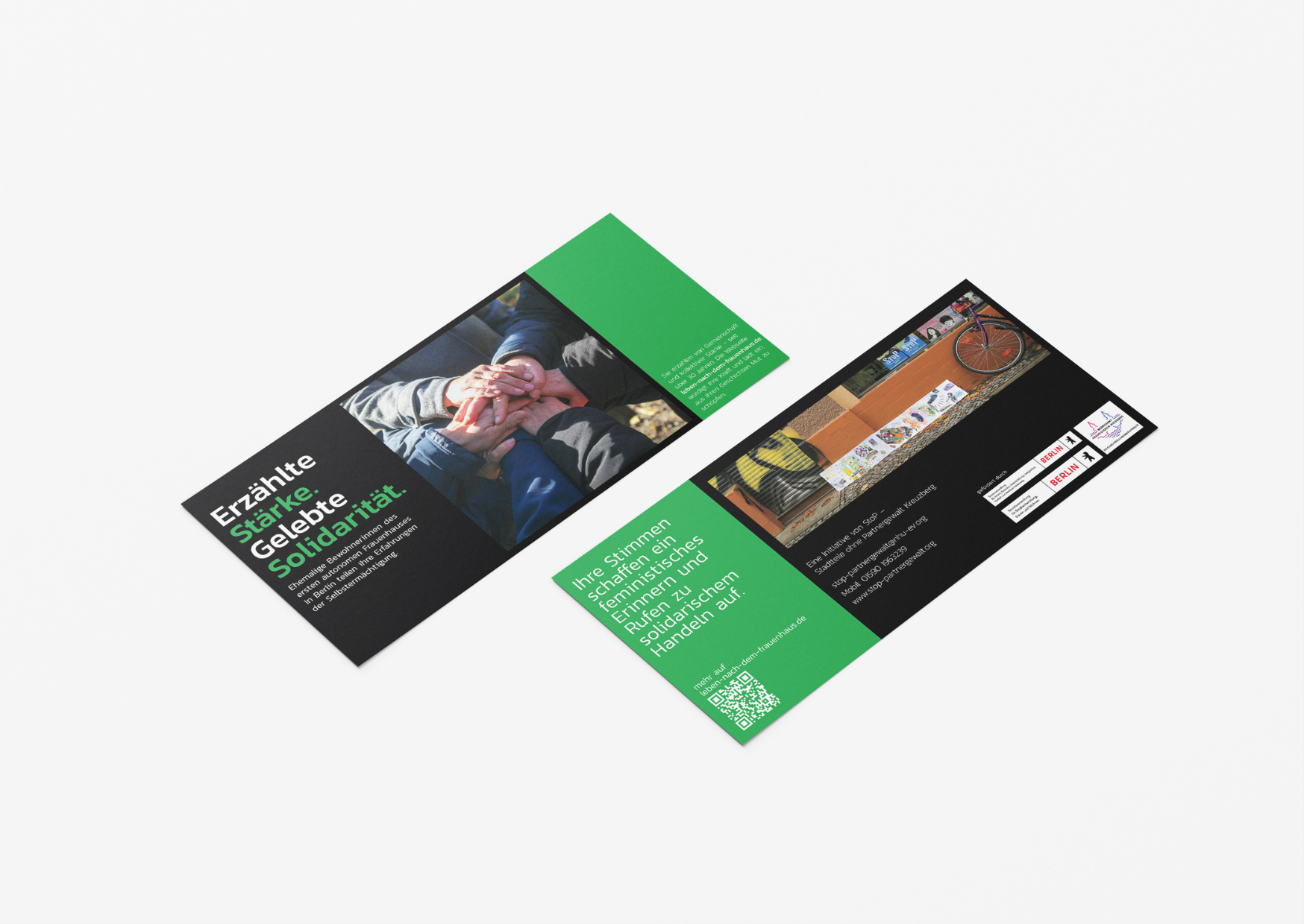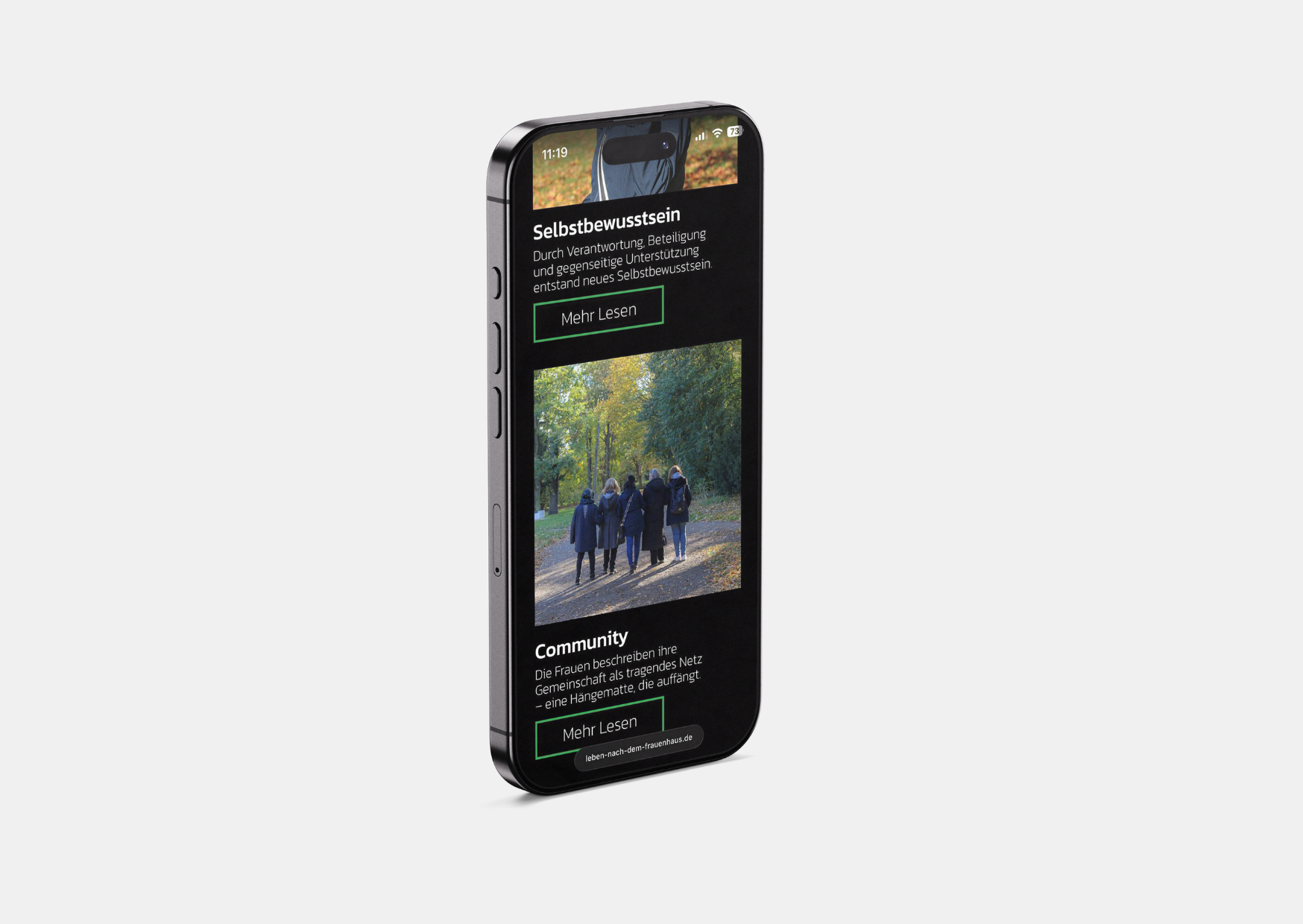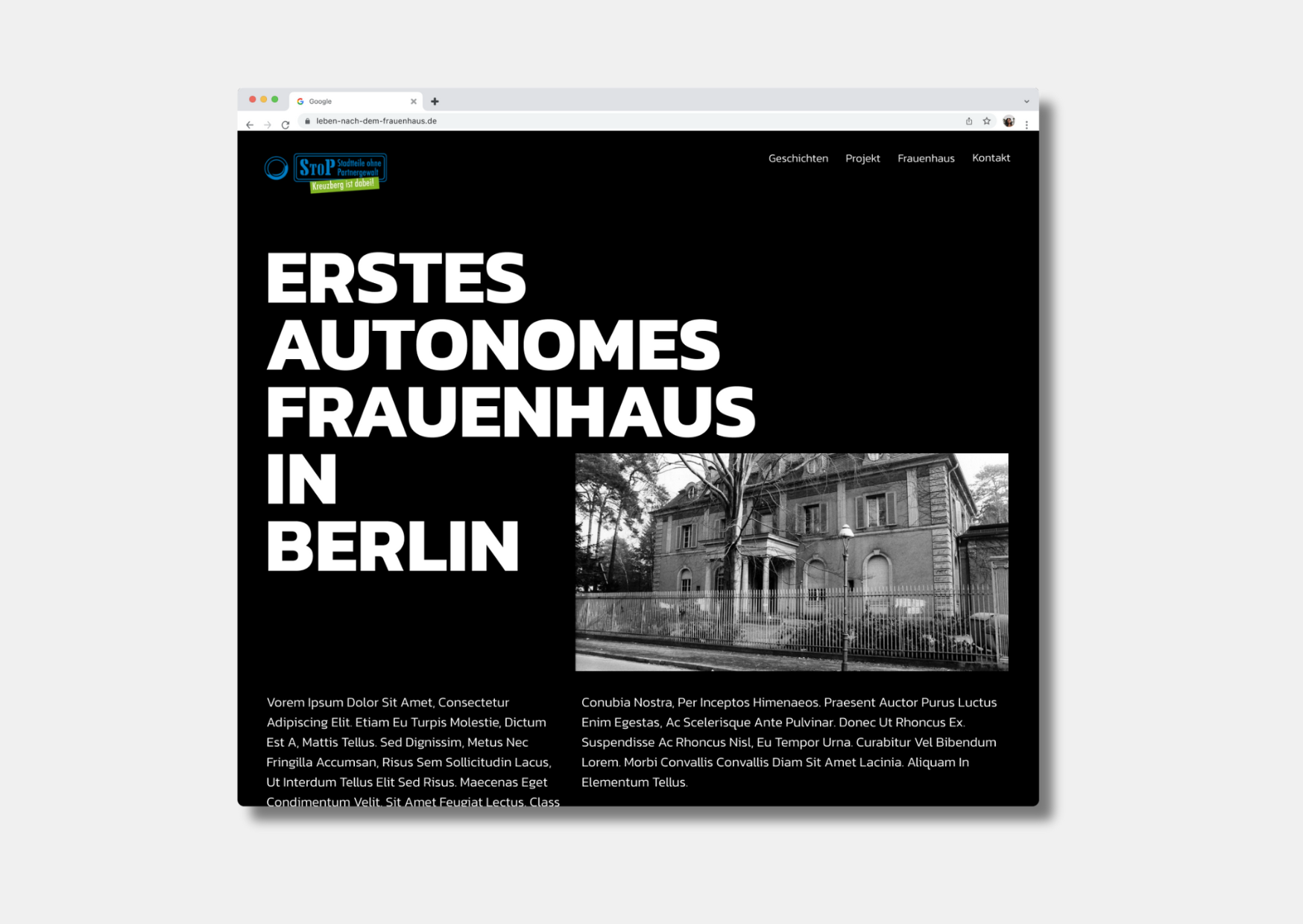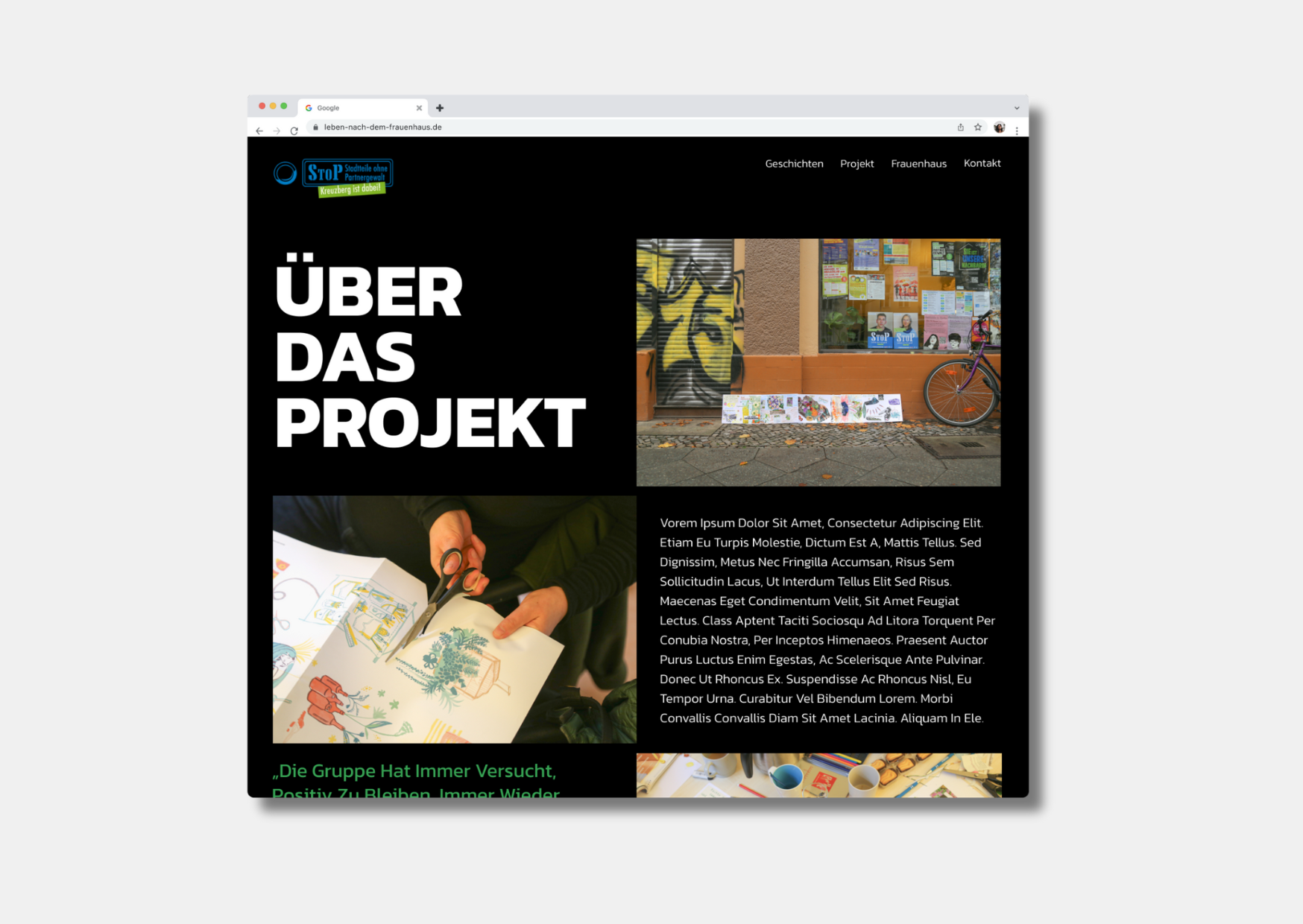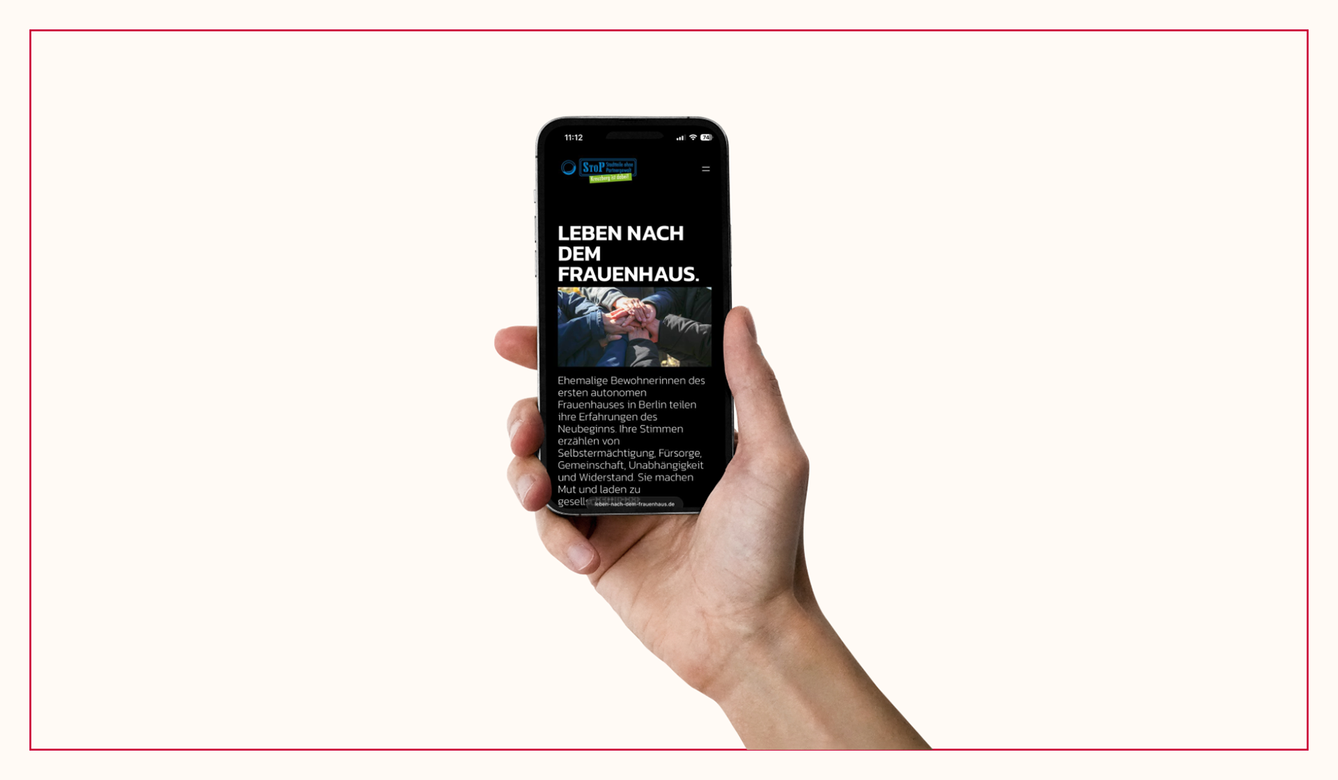 Für das Projekt Leben nach dem Frauenhaus habe ich eine Website sowie einen begleitenden Flyer gestaltet, die den Stimmen ehemaliger Bewohnerinnen des ersten autonomen Frauenhauses in Berlin Sichtbarkeit verleihen. Um die Botschaften kraftvoll zu kommunizieren, setzte ich bewusst auf prägnante Überschriften, großformatige Bildwelten und ein ungewöhnliches Layout, das Aufmerksamkeit schafft und den Inhalten Raum gibt. Die Gestaltung unterstützt Themen wie Selbstermächtigung, Gemeinschaft und Widerstand und lädt dazu ein, gesellschaftliche Verantwortung im Umgang mit Partnergewalt zu übernehmen. Website und Printprodukt greifen visuell ineinander und sorgen für eine klare, zugängliche und zugleich eindringliche Kommunikation.