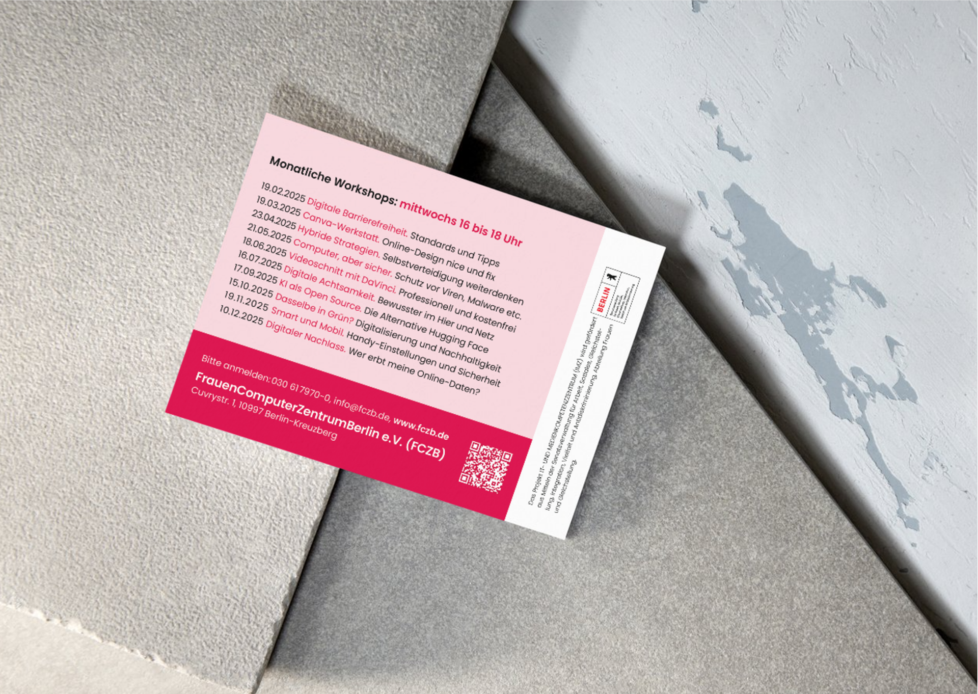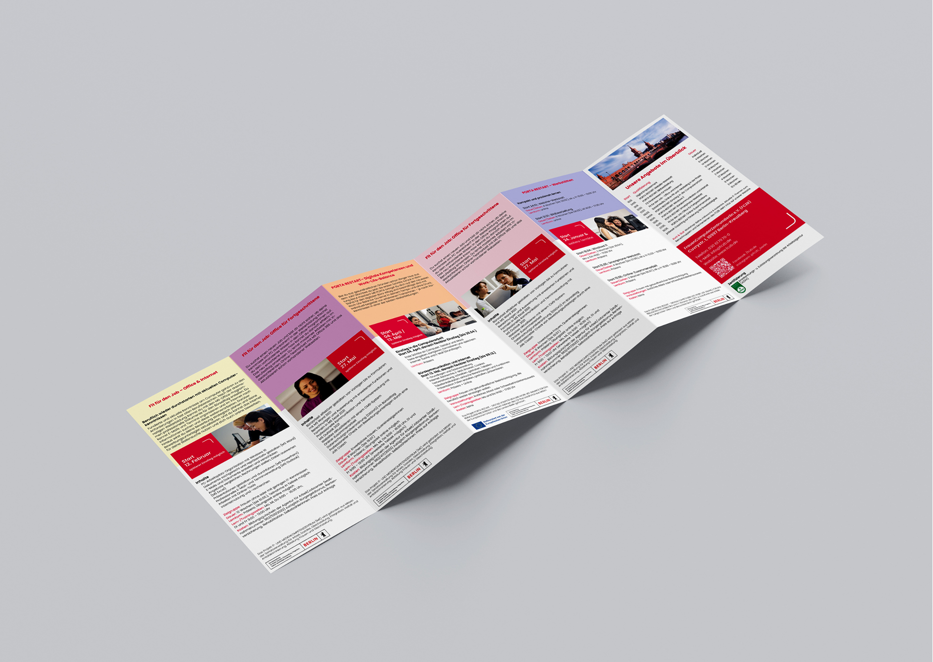 Durch ein strukturiertes und dynamisches Layout habe ich einen textlastigen sechsfaltigen Flyer in ein übersichtliches und gut zugängliches Kommunikationsmittel verwandelt, das die zentralen Informationen klar vermittelt. Der neue Aufbau ermöglicht eine bessere Leseführung und rückt wichtige Inhalte gezielt in den Fokus. Ergänzend dazu gestaltete ich eine Postkarte im gleichen Look & Feel, um eine visuelle Einheit zu schaffen – da beide Materialien häufig gemeinsam im Netzwerk verteilt werden.